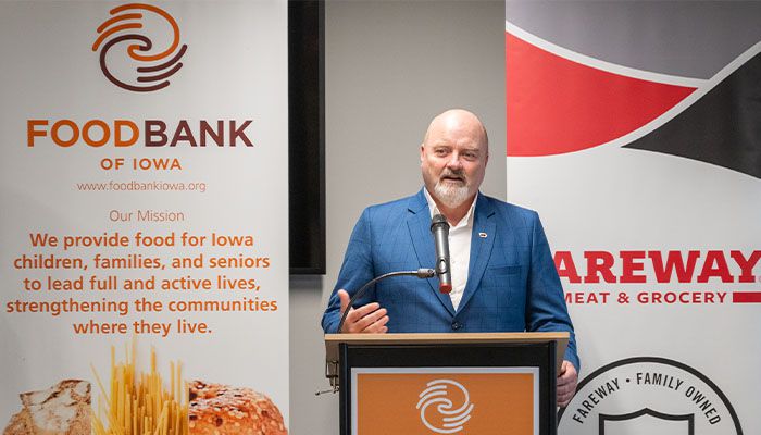 PICTURED ABOVE: Iowa Farm Bureau President Brent Johnson said Iowa farmers take pride in growing and raising the food that supports communities. Partnering with Fareway in the Meat the Need program, which provided 25,000 pounds of protein to Iowa food banks this year, is a valuable step toward meeting the challenge of food insecurity many families face. PHOTO / CONRAD SCHMIDT