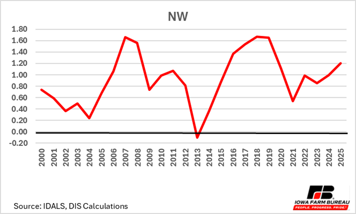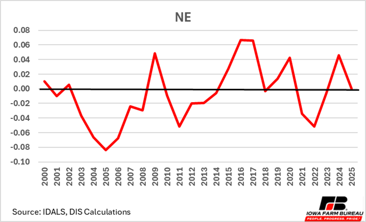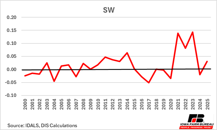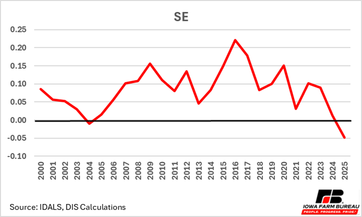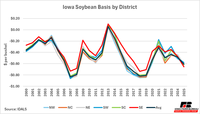 Typically, the Southeast region (Figure 8) has more favorable basis given their proximity to the Mississippi River, a major waterway used for transporting soybeans for export via barge transport. Notice that basis levels for 2025 in the Southeast region, which typically has the strongest basis, were weaker relative to the statewide average indicating to farmers that there may be benefits to putting beans in storage, despite limited space concerns. This is the first time since 2004 that SE Iowa soybean basis has been below the state average basis. The decline in exports for 2025, likely explains a more unfavorable basis in regions that capitalize on barge movement of soybeans.
