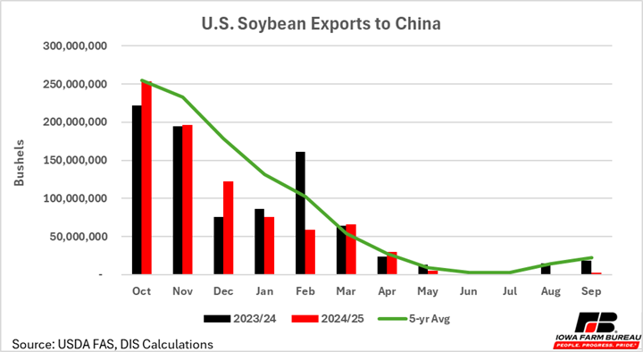 Soybean exports to China, the largest purchasers of U.S. soybeans, were essentially zero as the most recent marketing year closed out and fall harvest started. While U.S. soybean exports are typically not high in the final months leading up harvest and new marketing year, the previous marketing year and the 5-year average indicate that we typically see some exports this time of year and increasing into the U.S. fall harvest months (Figure 1).