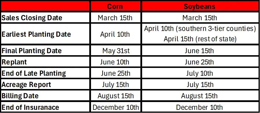 The earliest date for corn planting is April 10th, this applies statewide. The earliest plant date for soybeans is April 10th for the southern three tier counties and April 15th for the rest of the state (see Figure 1). Crops planted before these specified dates will not be eligible for replanting payments.