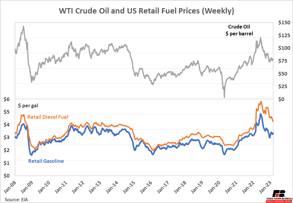 Recession fears have pushed crude oil prices lower over the past 6 months, and diesel fuel and gasoline prices have followed crude oil prices down. However, diesel fuel prices remain well above their historic relationship with crude oil prices. This new relationship started around the time Russia invaded Ukraine and has continued ever since. Diesel fuel prices are about $1.30 more expensive per gallon relative to the historic relationship between crude oil and diesel fuel.