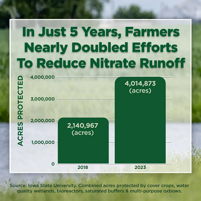 According to ISU, Iowa farmers have nearly doubled the acres protected by five key conservation practices that capture and filter nitrates in just five years – a sign of rapid momentum. These practices include the four listed above and cover crops (an in-field practice farmers use to hold soil in place and prevent runoff).