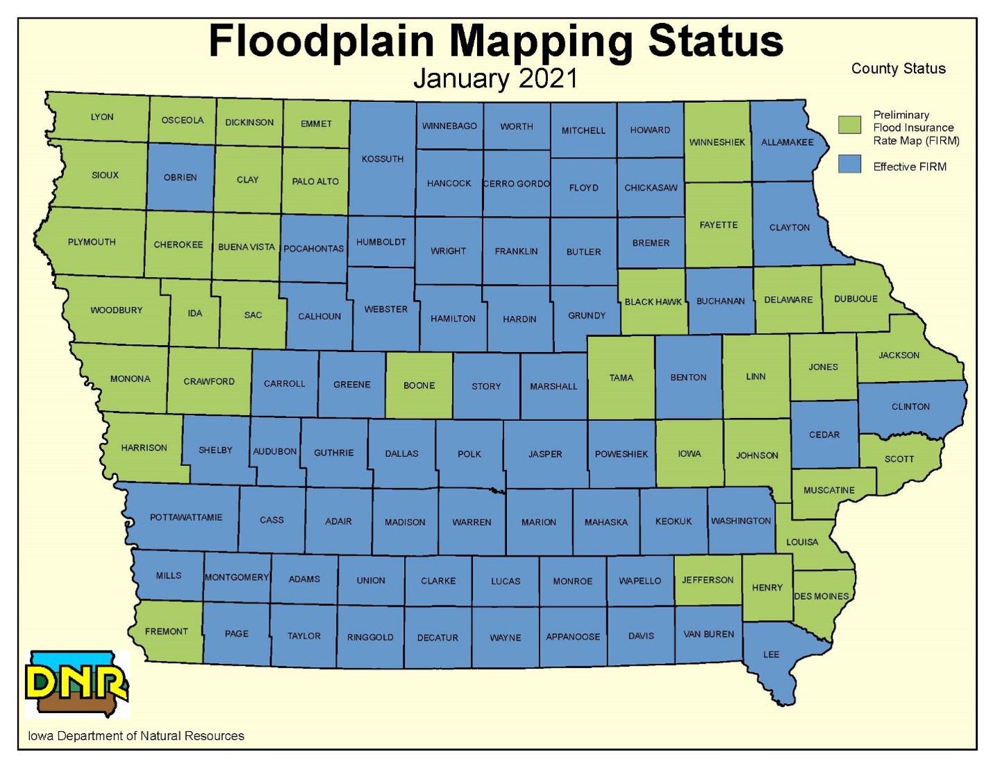 In the past, floodplain maps showing areas of risk were created by examining streams and planning for overflow. These maps outlined areas based on a 1% (100 year) risk of flooding. This approach has recently been determined to be outdated and incomprehensive. In more recent years, the DNR has now been using LiDAR overflights and HEC-RAS 6.0 software to create 2D maps of flood risk in areas of the state. Recent areas mapped with LiDAR can be found here. These new maps show more precise graduated risk of flooding. The 2D flood risk maps created with the software can be found here. The Iowa Flood Center and DNR has used this information to help counties obtain federal approval for county-wide Flood Insurance Rate Maps (FIRMs) as seen below.