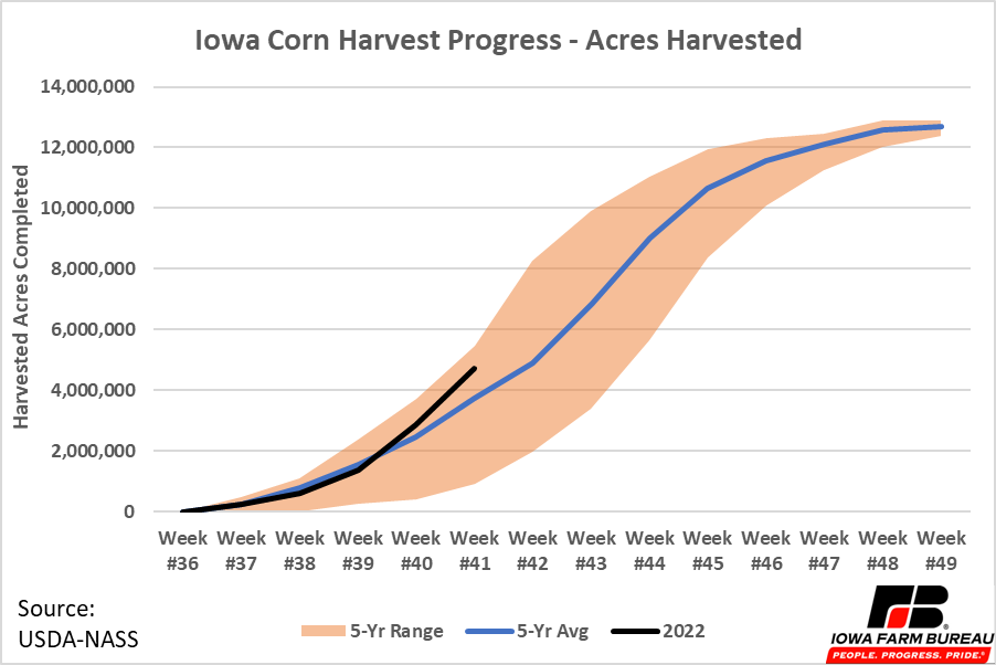 The USDA estimates 38% of Iowa corn has been harvested, up from 23% last week. After starting the year on pace with the 5-year average, two consecutive weeks of suitable weather allowed Iowa to surpass its 5-year average of 29% complete by Week 41. Iowa is now only slightly behind the paces set in 2020 and 2021, when 42% and 43% of corn acres were harvested by this time respectively. In terms of total acres, Iowa has around 4.7 corn million acres harvested, above the year average of 3.7 million and only slightly behind the 5.4 million completed by this time in 2020 and 2021.