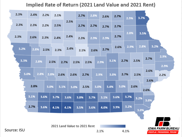 The average rate of return due to appreciation in land values for the period of 2011 through 2021 is shown in Figure 9. The highest rates of return due to appreciation have been in southcentral Iowa with rates of capital appreciation between 4.3% and 4.9% per year.
