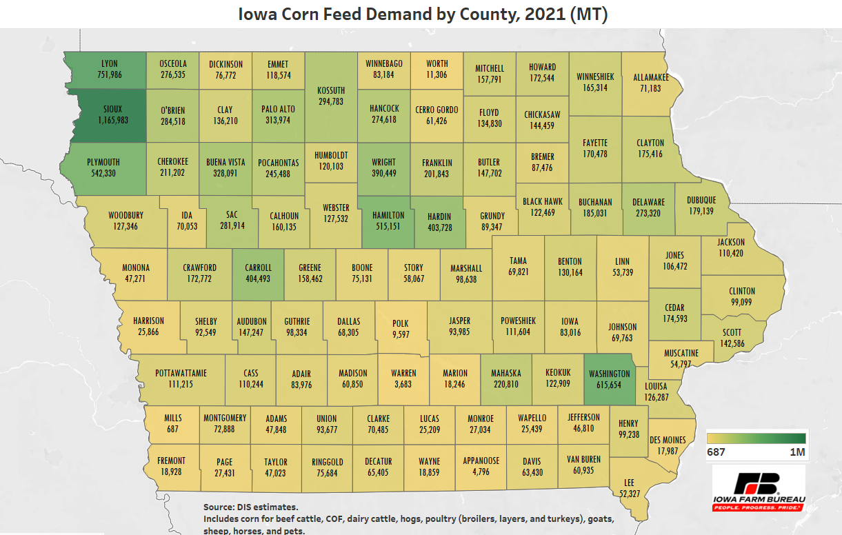 Figure 1. Iowa Corn Feed Demand by County, 2021 (MT)