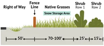 The Conservation Reserve Program (CRP) provides a “Living Snow Fence” practice designed to set aside land as a living snow fence. This practice (CP17A) is available under Continuous CRP and allows the landowner to receive 50% cost share for establishment costs plus annual payments for up to fifteen years if they agree to plant two rows of trees, or a combination of trees and shrubs, along with seventy – one hundred feet of native grasses such as illustrated below.