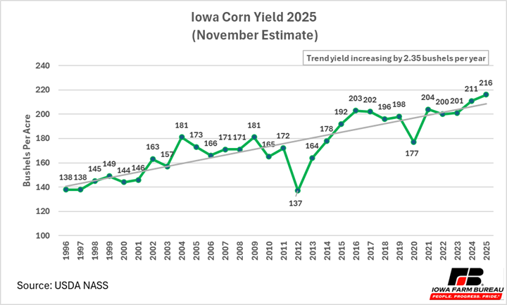 Iowa experienced a record high corn yield of 216 bushels per acre, a 2.4% increase from November 2024 (Figure 2). Iowa’s trend yield is increasing by 2.35 bushels per acre per year since 1996.